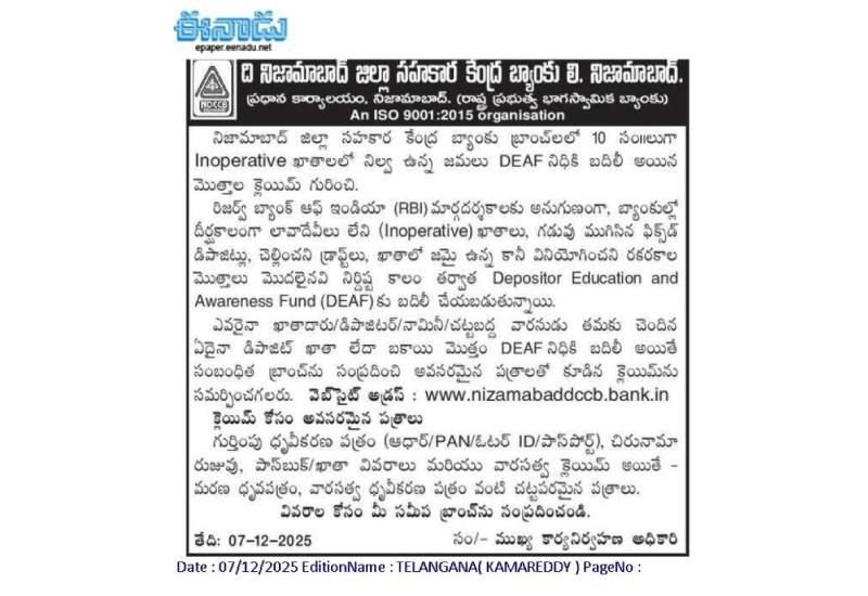 The Nizamabad District Co-operative central Bank (DCCB Nizamabad) is one of the oldest bank in the Telangana State, which was established on 19.11.1922, the bank is operating with a network of 63 branches and has 143 PACS affiliated to it serving the farmers in erstwhile Nizamabad district .